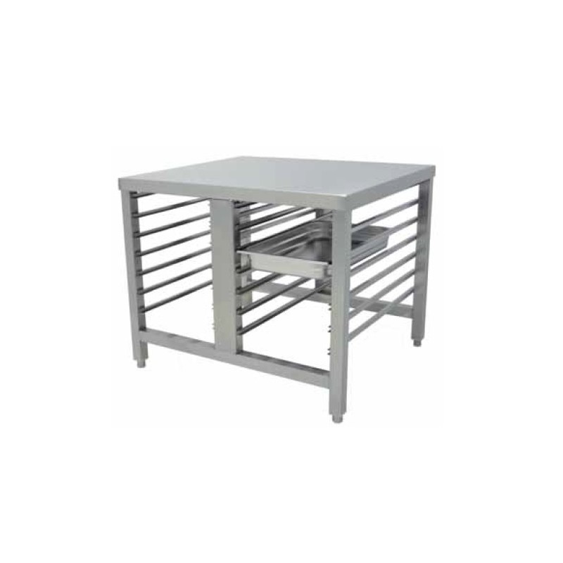 Mesa soporte horno 85 x 85 x 70 cm., totalmente fabricado en chapa de acero inoxidable AISI 304, 18/10. Bastidor inferior en tubo de acero inoxidable. Guías soldadas a estructura. Patas regulables en altura con rosca oculta.