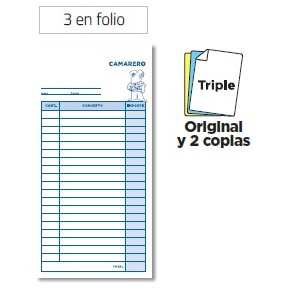 Talonario camarero "3/Fº" "Original y dos Copias" (10 uds.), formato natural. Con copia para el cliente.