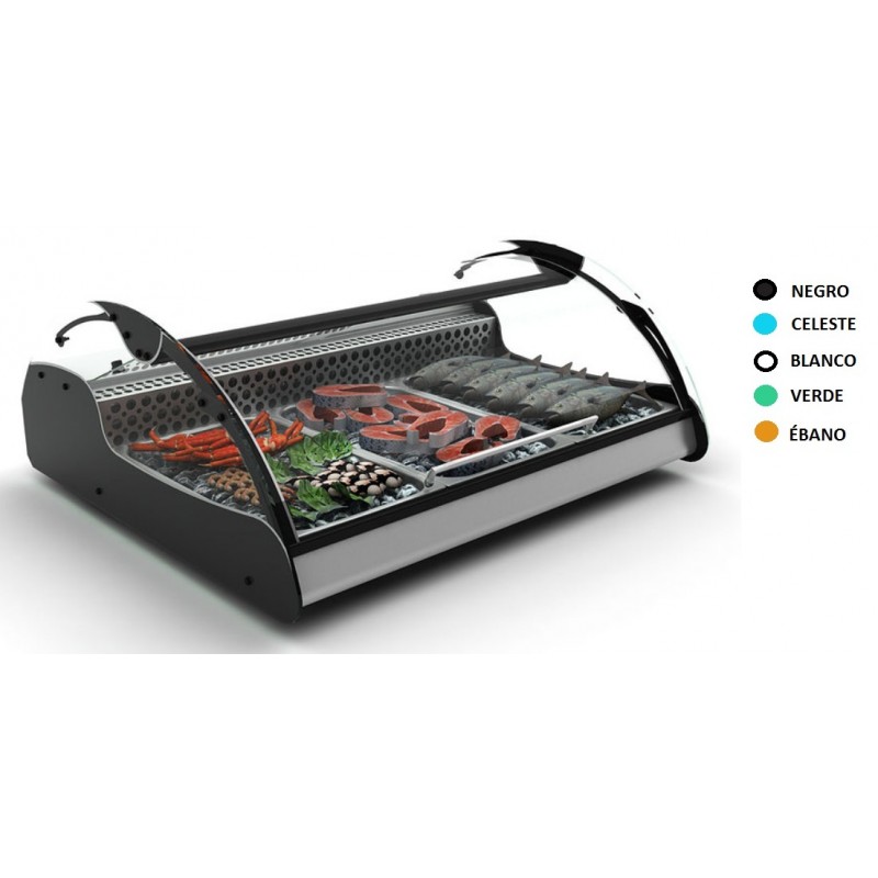 Construção em aço inox AISI 316 anticorrosivo, especialmente projetado para a exposição direta de peixes em uma cama de gelo esmagado.